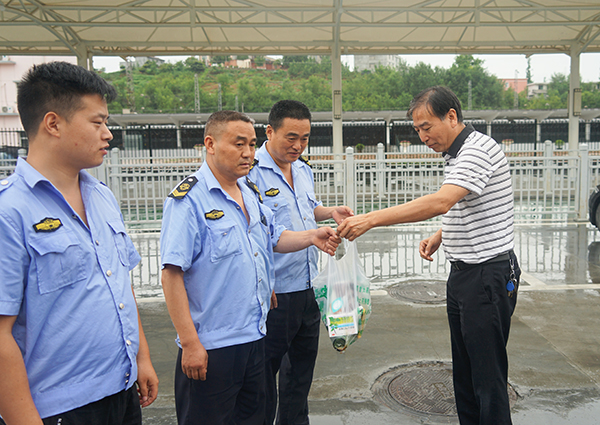 在火車站調(diào)度室,張曉強(qiáng)一行檢查當(dāng)日帶班領(lǐng)導(dǎo)、值班人員在崗在位情況,了解值班值守落實(shí)制度、工作安排和落實(shí)等情況。為駕駛員送去了毛巾、菊花茶、花露水、風(fēng)油精等降溫物品,與他們一起拉家常,詳細(xì)詢問身體情況、工作和生活現(xiàn)狀,認(rèn)真傾聽面臨的困難訴求和對當(dāng)前工作的意見建議,叮囑他們做好夏季防暑降溫、安全運(yùn)營工作。